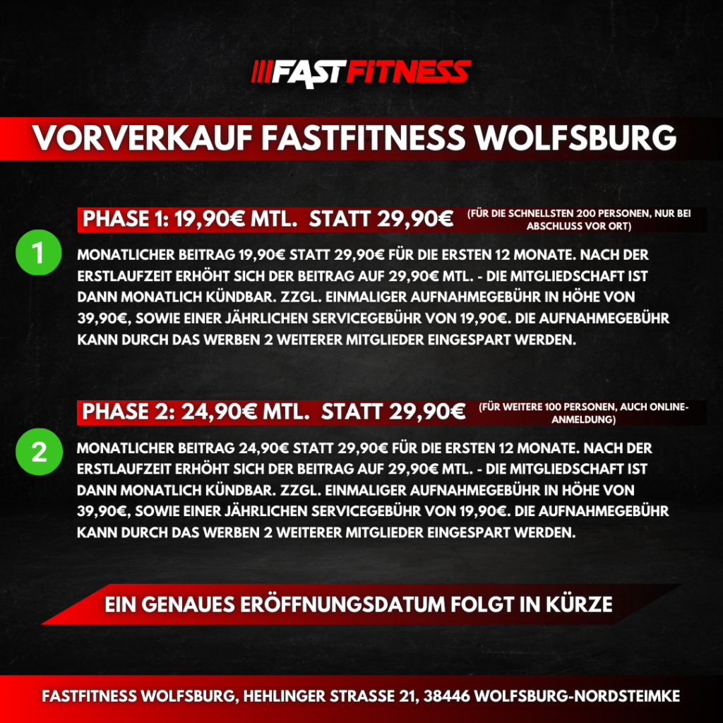 Der Vorverkauf findet sowohl in unserer Fläche im neuen FastFitness Wolfsburg, als auch Online statt. Interessenten haben vor Ort die Möglichkeit Ihre Fragen zu stellen, bereits einen Überblick vom Fitnessclub zu erhalten und vergünstigt Mitgliedschaften abzuschließen.